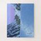 Eine 3D-Fantasielandschaft voller schillernder Schnee und zauberhafter Lichter. Eine Reihe von silbernen Glühlampen beleuchtet den Weg durch einen schneebedeckten Bergpass, der von steilen Felsklippen eingezäunt ist. Der schneebedeckte Pfad wird von dunklen Tannenbäumen eingezäunt.