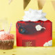 Design mit stilisierten Auspicious Wolken in weiß + 2 Blume in 3D + dunkelblaues Tigerpapier geschnitten mit Drop-Schatten (Bild gedruckt) in einem roten Quadrat mit Schlagschatten mit dunkelrotem Hintergrund. Design auf Verpackungspapier mit "Happy New Yea" in Chinesisch.
