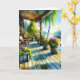 Denken Sie an Ihre Karte. Kunstwerk mit schönem Ausblick auf ein Deck eines Seehauses mit Blick auf die Bucht mit Bootsdocks und einem Deck, das von Blume umgeben ist.