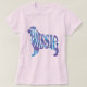 Cleverly designed words "Aussie" in the shape of the dog breed, lettering filled with blue and purple tie dye pattern,