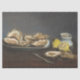 Dieses Design zeigt ein Gemälde des französischen Künstlers Edouard Manet (1832-1883). Es handelt sich um ein Stillleben-Gemälde mit einem Tisch mit frisch zubereiteten Austern, die zum Essen bereit sind; es gibt auch eine Austerngabel und eine geschnittene Zitrone, die über die Austern gepresst werden soll. Es handelt sich um eine wunderschöne Darstellung der feinen Küche und der französischen Küche. Das Originalwerk wurde 1862 gemalt.