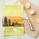 Das stilvolle Küchentuch mit Austin Texas City Skyline-Silhouette mit Sonnenuntergang, Aquarell und Koordinaten der Längen- und Breitengradkarte