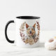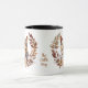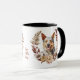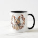 Ein hübscher Herbstkranz in Zimtbraun, Bräune und Creme umgibt das Aquarellbild eines australischen Rinderhundes. Das Bild wird zweimal auf der Tasse gedruckt, wobei der eigene Text dazwischen liegt.