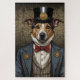 Charmanter australischer Schäferhund ist mit einem englischen Aristoteles-Anzug angezogen. Weißes Hemd und rote Fliege. Hochgeformter Hut.