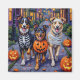 Adorable australische Schäferhunde, die in verspielten Halloweenkostümen gekleidet sind, tragen Kürbiseimer, während sie unter dem mondbeleuchteten Himmel tricksen oder behandeln. Dieses festliche Design hebt den flauschigen Mantel der Rasse, intelligente Augen und spielerische Persönlichkeit hervor, die perfekt die gespenstische und dennoch lustige Atmosphäre Halloween-Abends einfangen. Eine wunderbare Feier für Hundefreunde und Halloween-Fans gleichermaßen.