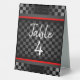 Auto Racing Checkered Design Zelt-Style Table Sign mit anpassbarem Text auf beiden Seiten.
