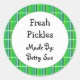Un autocollant de conserve ou de cuisson sur mesure avec un script manuscrit et des lettres de bloc sur un motif plaid vert rétro avec de petites bandes blanches et bleues pour les cornichons, confitures ou autres recettes.