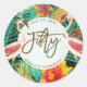 Des autocollants de fête de cinquante ans avec un design feuille/flamand de palme et des lettres typographiques. Facile à modifier ou à supprimer les autres champs de texte pour répondre à vos besoins personnels. Correspondance papeterie et autres articles disponibles dans cette collection boho tropicale funky.