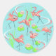 Des flamants roses vifs battent leurs ailes et frottent leurs plumes contre un arrière - plan bleu aquatique avec des roseaux et des nénuphars. Un design élégant avec une touche rétro qui peut être personnalisé avec votre propre texte, images et idées. Une image d'art numérique originale créée par Quirky Chic.