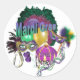 Un autocollant rond qui correspond à notre invitation "Mardi Gras" avec une image festive d'un coiffeur en plumes, des masques à plumes, un casquette à paillettes fuchsia, des perles, des ballons violets, verts et or, et deux coeurs améthystes violets. Voir collant vinyle taillé sur mesure, confetti, invitation, enveloppe, sac de faveur, ballotin, étiquette de faveur, sacs cadeaux, étiquette et papier d'emballage. Voir toute la collection Mardi Gras Sticker dans les INVITATIONS | Section Stickers & Étiquettes.