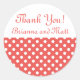 Mignonne, douce et un peu rétro. Joli et traditionnel polka rouge, merci les autocollants avec les noms de mariée et de mariée dessus. Envoyer des remerciements pour la douche nuptiale et les cadeaux de mariage dans le style.