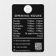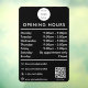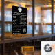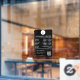 Un autocollant de fenêtre d'heures d'ouverture noir et un adhésif de fenêtre présentant le logo de votre entreprise, le code QR, vos icônes de médias sociaux personnalisés et vos coordonnées. Un adhésif de fenêtre d'heures de magasin personnalisé parfait pour les vitrines de magasins et les enseignes de porte d'entrée. Parfait pour un propriétaire de magasin qui souhaite informer ses clients sur ses heures d'ouverture.