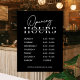 Modèle de décalque de fenêtre d'heures d'ouverture d'entreprise minimaliste avec espace pour le nom de votre entreprise, heures d'ouverture et site Web sur fond noir. Ce décalque de fenêtre d'entreprise éditable est un excellent moyen d'afficher vos jours et heures d'ouverture sur la vitrine de votre magasin - peut être utilisé pour votre café, restaurant, salon ou toute autre entreprise.