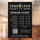 Vous cherchez un moyen simple de montrer votre salon, votre magasin ou vos horaires d'ouverture d'entreprise? Découvrez cette White Business Logo Heures d'ouverture et code QR Cling de fenêtre. Vous pouvez ajouter tous vos détails en remplissant les champs modèles. Vous pouvez modifier chaque bloc de texte et même modifier le style des polices à l'aide de l'outil de conception. Heureux de Customiser !