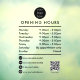Un autocollant de fenêtre noir pour les heures d'ouverture et un adhésif de fenêtre présentant le logo de l'entreprise, le code QR, vos icônes de médias sociaux personnalisés et les coordonnées. Un adhésif de fenêtre personnalisé pour les heures d'ouverture parfait pour les vitrines et les enseignes de porte d'entrée. Parfait pour un propriétaire de magasin qui souhaite informer ses clients sur ses heures d'ouverture.