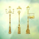 Une variété de lampadaires victoriens lampadaires en or. Élégant accrochage de fenêtre d'hiver.