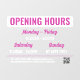 Opening hours window cling with a combo of clean fonts and a retro script in white and magenta for an eye catching design so your customers and clients can instantly find your opening hours. Add your contact info as well along with a QR code your customers and clients can scan to access your website and social media. The window cling has a clean and chic design without logo, perfect for your beauty salon, clothing boutique, and more!