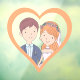 Cette belle fenêtre mariage accrochée présente une charmante illustration d'une mariée et d'un marié en forme de coeur. Le marié est représenté avec des cheveux bruns courts, un teint clair, et porte une veste de costume bleu marine sur une chemise bleu clair et une cravate blanche. Il a une petite boutonnière épinglée sur son revers. La mariée se tient à côté de lui, souriant doucement. Elle a des cheveux ondulés, rougeâtre-oranges, ornés d'une couronne de fleurs rose, orange et blanche. Un délicat voile blanc coule derrière elle. Elle porte une robe mariage blanche avec un collier d'amoureux et un collier de perles. Cette illustration simple, en forme de dessin animé, suggère un lien amoureux des cordes entre eux. C'est fantaisiste et attachant, donnant un ton joyeux au prochain mariage.