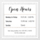 Explorez la commodité de notre "Sticker à heures ouvertes : Customisez votre horaire". Conçu avec simplicité, cet autocollant présente un arrière - plan blanc propre avec des lettres noires audacieuses, assurant ainsi que vos heures d'affaires sont facilement remarquées. Avec des jours personnalisables de la semaine, les heures d'ouverture et de fermeture, et même une section d'observation, cet autocollant devient adapté à vos heures de travail uniques. Affichez-le sur votre porte ou votre fenêtre pour communiquer efficacement votre disponibilité. Cet autocollant devient un outil essentiel pour votre établissement, permettant aux clients et aux passants de saisir rapidement quand vous êtes prêt à servir. Commandez dès maintenant pour améliorer le professionnalisme de votre entreprise et clarifier vos heures d'ouverture. Remarque : Customisez la description et les détails pour qu'ils correspondent à votre produit spécifique tout en mettant l'accent sur la personnalisation, la commodité et les aspects de conception classique.