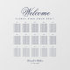 Un simple tableau transparent avec 15 tables, recommandé pour un mariage bleu marine. Il s'agit d'un cling de fenêtre, à mettre sur une fenêtre ou une autre surface transparente en verre ou acrylique. Tout le texte est bleu marine. Le mot Welcome est écrit dans un élégant script calligraphique, le reste en casquette. Les tables sont sur 3 rangées. Au-dessus d'eux et sous le mot Bienvenue, il y a le message "S'il vous plaît trouvez votre siège!". Sous les tableaux, il y a les noms de mariée et de mariée, écrits dans le même script, et la date.