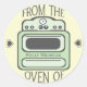 Un autocollant mignon mais fonctionnel avec un poêle rétro en vert surligné en gris sur un arrière - plan blanc cassé. Le texte gris ci-dessus et ci-dessous dit "Du four de". Personnalisez avec votre nom sur la cuisinière. Coeurs gris de chaque côté.