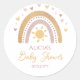 Ces autocollants de baby shower adorables présentent un style bohème. Un arc-en-ciel pastel mignon est décoré de soleil et de cœurs sur un fond blanc simple.