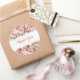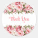 Un autocollant rond de remerciement est illustré avec une jolie impression florale de pivoine rose.