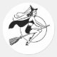 Une sorcière amusante et rétro sur un balai, volant devant la pleine lune. Un joli et décalé toucher de finition ou un petit cadeau supplémentaire amusant pour la sorcière dans votre vie.