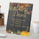 Badigeonnez de botaniques floraux et de citrouille orange rouillé sur un bois de grange foncé avec des lampes à cordes signe dessert fête d'anniversaire.