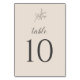 Simple et élégante, avec un charme minimaliste, cette belle carte de table mariage est décorée dans des tons neutres qui s'accordent bien avec une variété de palettes de couleurs mariages. Montrée ici en beige d'automne, une simple tige fleurie ajoute un élément élégant au bord supérieur du design. REMARQUE : Pour créer une carte de table pour chaque table, vous devez les créer une par une. Modifiez le numéro du tableau, c'est-à-dire le tableau 1 et ajoutez au panier. Modifiez ensuite le tableau numéro 2 et ajoutez au panier. Faites ceci pour chaque table dont vous aurez besoin jusqu'à ce que tous les nombres soient créés. Une fois que vous les avez tous ajoutés au panier, vous pouvez terminer le processus de retrait.
