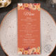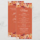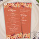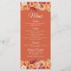 Menu Floral Automne. Contre un arrière - plan orange rouille, ce menu mariage présente des fleurs aquarellées dans des couleurs automnales parfaites : orange, rousse, jaune, rouge et rose, avec des accents dorés. C'est parfait pour les styles de mariage classiques, contemporains et vintage pour la saison d'automne. Parcourez la sélection des invitations de coordination, des cartes RSVP, des panneaux, et plus encore.
