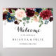 Cet automne calligraphie rustique signe d'accueil mariage est parfait pour un mariage moderne. Le design est composé de fleurs bordeaux, rouges, navales, bleues et rousses rayonnantes et gracieuses peintes à la main, inspirant la beauté naturelle. Faites de cette affiche votre propre en ajoutant le nom de la mariée et du marié, ainsi que la date du mariage.