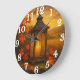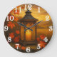 Serene autumn clock featuring a glowing vintage lantern encircled by crimson maple leaves at twilight. White numerals on warm-toned backdrop create cozy seasonal charm—perfect for Thanksgiving decor or cozy cabin ambiance.
