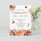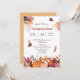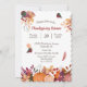 Farbenfrohe fallende Blätter, Herbstliche Blume, Blattwerk und Kürbisse bilden einen hübschen Rahmen um Ihren eigenen Text auf der Vorderseite dieser Erntedank-Dinner-Einladung. Der Text ist in zartem Braun- und Braunrot in der Mitte, und es gibt viel Platz für Ihre Anpassung. Alles ist auf einem knalligen weißen Hintergrund platziert. Die Rückseite der Einladung ist fest passend Gold. Fröhlich!