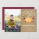 Herbst in Liebe mit diesen bezaubernden rustikalen Kindergeburtstag Party Einladungen mit einem LieblingsFoto auf der links Seite. Das Design umfasst einen orangefarbenen Kürbis mit bordeauxroten, rosa und orangefarbenen Blume und grünem Blattwerk auf einem kraftvollen Hintergrund. "Unser kleiner Kürbis dreht sich" erscheint oben in schicken Kalligraphie-Schriftzeichen mit dem Alter Ihres Kindes auf dem Kürbis. Beispiel zum ersten Geburtstag gezeigt. Personalisieren Sie Ihre Geburtstagsfeierdetails in weißer Schrift.