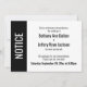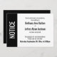 Voici une carte audacieuse et moderne pour avertir vos invités s'il est nécessaire de changer votre date de mariage. Utilisez les champs modèles pour ajouter vos détails personnels et faire de cette conception unique et simple votre propre. Un bloc de couleur le long de la gauche est noir, correspondant au texte et à l'arrière de la carte; "NOTICE" apparaît en gras blanc sur cette bande à gauche. Toutes les polices et couleurs sont également modifiables. Veuillez communiquer avec toute demande spéciale ou customiser de l'aide. D'autres pièces avec un autre libellé sont également disponibles dans la collection.