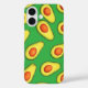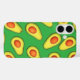 The avocados have vibrant green skin and an orange-red pit in the center, arranged in various orientations over a light green background. The design uses flat colors and an overhead perspective, creating a simple and visually appealing pattern.