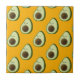 Ein Avocadomuster im Stil eines Cartoon auf einem orangefarbenen Hintergrund. Originelles Design. Individuell gestaltete Fliesen. Geschenkidee für Avocado Liebhaber.