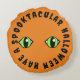 Ce coussin rond a un message de vacances pour vos invités. Le centre a les yeux verts et le message, en orange, dit "Avoir une Halloween Spooktaculaire". Le dos est orange, avec du texte noir.