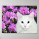 Weiße Katze mit lila lavenderisch gefärbten Azaleen. Die blauen Augen der Katze passten zum Azaleen-Foto-Poster. Für 14x11 ausgelegt