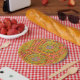 Farbenvolles Aztekendesign, handbemalt mit orangefarbenen, roten, rosa, grünen und gelben Tellern illustriert, ist nützlich und ein Genuss für Ihr nächstes Party oder für jeden Anlass an jedem Tag.