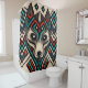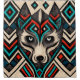 Das ist ein handgefertigtes, dekoratives Wolfsgesicht mit Azteken-Mustern in den Farben Schwarz, Rot, Türkis und Beige.