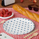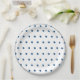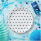 Azurblauer Polka Punkte auf massivem weißem Hintergrund. Außerhalb des geometrischen Kreises silberne Trimm. Original Artwork Design © TamiraZDesign.