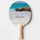 Personalisiertes Pingpongpaddel mit schönem Foto. Ein weißer Sandstrand mit einer sanften Brandung. Das türkisblaue Wasser umgibt einen zackigen Felsen.