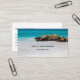 Visitenkarten mit einem schönen Foto. Ein weißer Sandstrand mit einer sanften Brandung. Das türkisblaue Wasser umgibt einen zackigen Felsen.