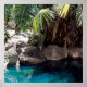 Von seinem Teich umgeben, umgeben von großen Palmen, genießt ein Baboon seine Ruhe