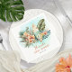 Gender neutrale Baby Dusche Einladungs-Design, das gut für einen Jungen oder ein Mädchen funktioniert. Die tropische botanische Surfszene bietet im Sommer ein Surfthema mit Blumen- und Monstera-Hibiskus und Palmen. Design hat ein ozeanisches Strandstadtlebnis in Pfirsichtönen, Rosa, Terrakotta und Aqua mit Salbei grün bis aquamarine Vegetation. Gegenüber von Holiday Hearts Designs.