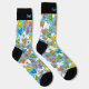 Cartoon von Kleintieren. Schnecken, Schmetterlinge, Vögel, Bienen, Sonne und Wolken. Nahtloses Muster. Benutzerdefinierte Hintergrundfarbe. Benutzerdefinierte Farbe des oberen Streifens. Benutzerdefinierter Text auf jeder Socke.