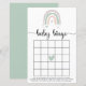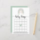 Niedliches Baby Bingo Duschspiel mit abstrakter boho Wasserfarbe eines schluchgrünen, orangefarbenen und lavendelfarbenen Regenbogens mit Herz und "Baby Bingo" in einem stilvollen Drehbuch mit Schluckauf.