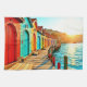 Treten Sie ein in einen lebendigen Küstentraum, in dem Sie von einer beeindruckenden Strandpromenade in Richtung Meer geführt werden. Dieses Meisterwerk der KI, akribisch durch einen geschickten Künstler ergänzt, fasziniert die atemberaubende Schönheit eines sonnengeküssten Hafens. Jedes hell gemalte Boathouse steht als ein Leuchtfeuer der Freude und reflektiert das warme, einladende Licht der untergehenden Sonne. Verlieren Sie sich in dieser malerischen Szene, in der sich ruhiges Wasser und leuchtende Farben vereinigen, um einen Augenblick voller Ruhe und kreativen Wunder zu schaffen.